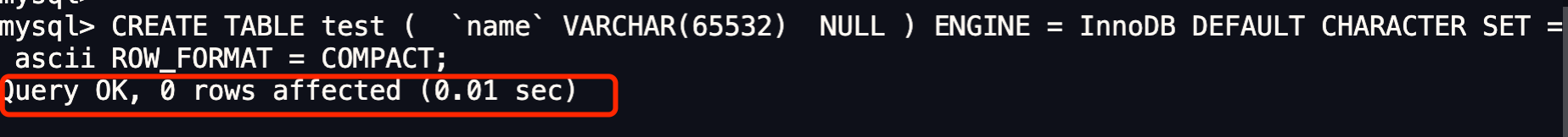) ENGINE = InnoDB DEFAULT CHARACTER SET = ascii ROW_FORMAT = COMPACT;看能不能成功创建一张表: