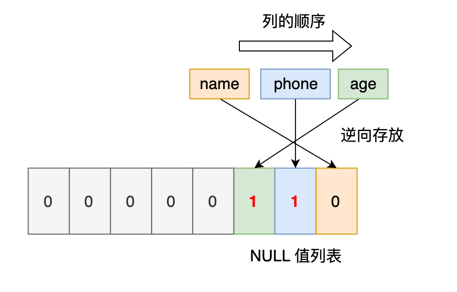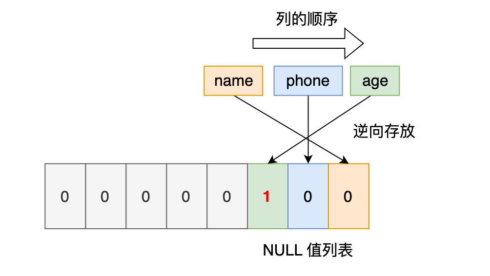同样的道理,NULL 值列表的信息也需要逆序存放。