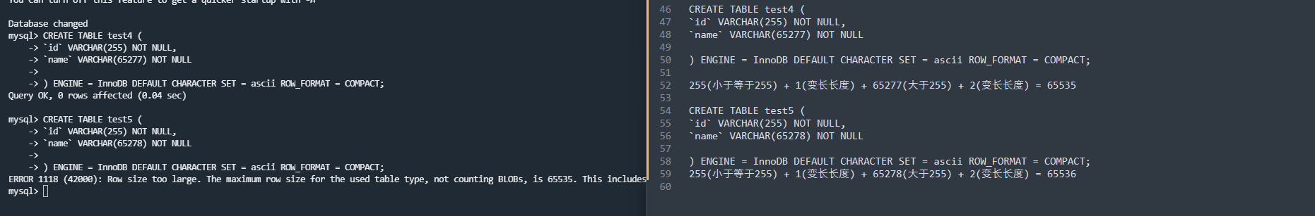 可以看到,创建成功了。说明我们的推论是正确的,在算 varchar(n) 中 n 最大值时,需要减去「变长字段长度列表」和「NULL 值列表」所占用的字节数的。