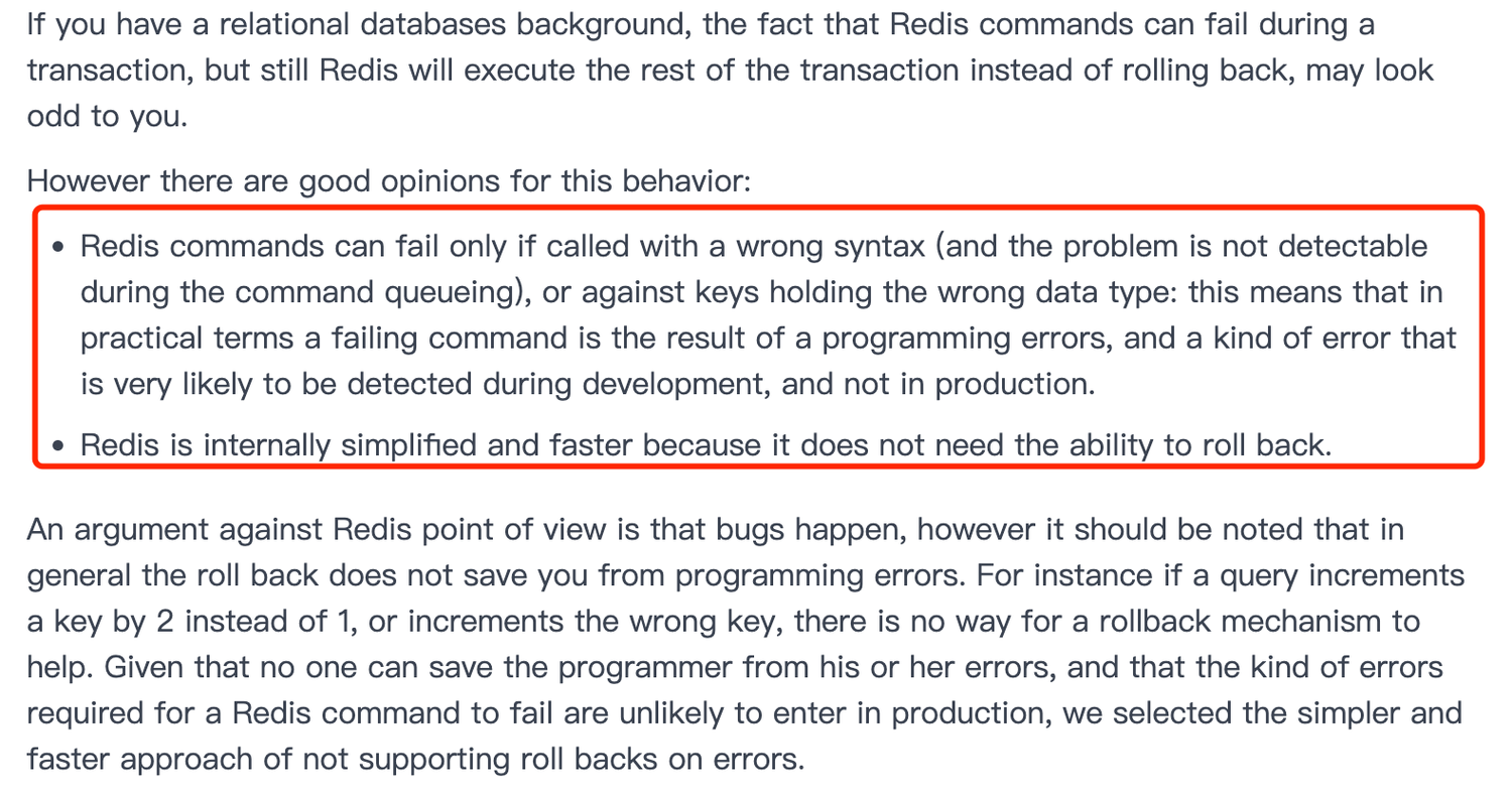 - 他认为 Redis 事务的执行时,错误通常都是编程错误造成的,这种错误通常只会出现在开发环境中,而很少会在实际的生产环境中出现,所以他认为没有必要为 Redis 开发事务回滚功能;