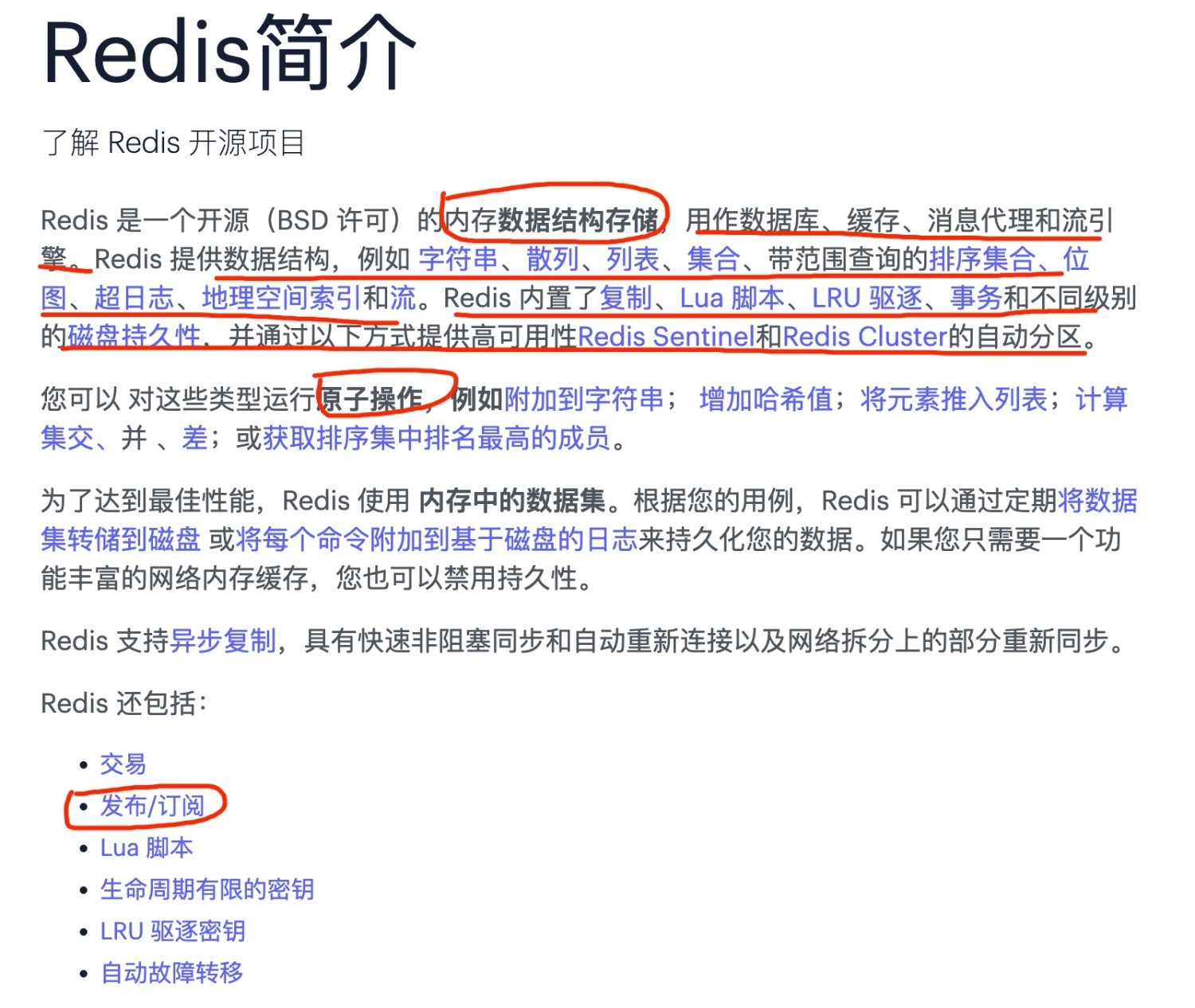 Redis 官方的介绍原版是英文的,我翻译成了中文后截图的,所以有些文字读起来会比较拗口,没关系,我会把里面比较重要的特性抽出来讲一下。