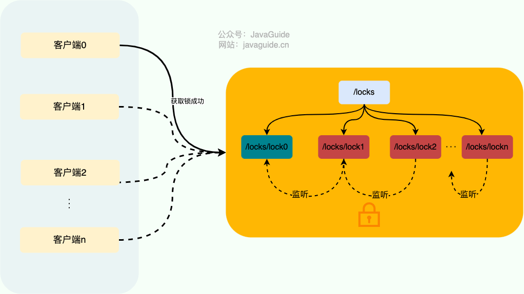 同一时间段内,可能会有很多客户端同时获取锁,但只有一个可以获取成功。如果获取锁失败,则说明有其他的客户端已经成功获取锁。获取锁失败的客户端并不会不停地循环去尝试加锁,而是在前一个节点注册一个事件监听器。