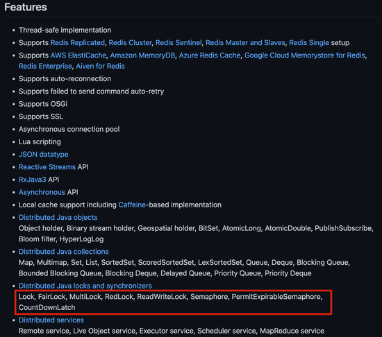 Redisson 是一个开源的 Java 语言 Redis 客户端,提供了很多开箱即用的功能,不仅仅包括多种分布式锁的实现。并且,Redisson 还支持 Redis 单机、Redis Sentinel、Redis Cluster 等多种部署架构。