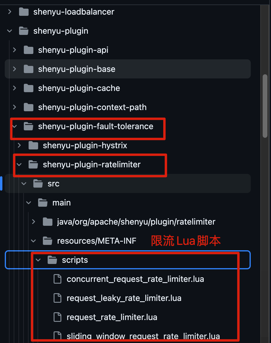 我这里就不放具体的限流脚本代码了,网上也有很多现成的优秀的限流脚本供你参考,就比如 Apache 网关项目 ShenYu 的 RateLimiter 限流插件就基于 Redis + Lua 实现了令牌桶算法/并发令牌桶算法、漏桶算法、滑动窗口算法。