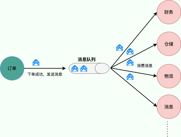 例如,我们商城系统分为用户、订单、财务、仓储、消息通知、物流、风控等多个服务。用户在完成下单后,需要调用财务(扣款)、仓储(库存管理)、物流(发货)、消息通知(通知用户发货)、风控(风险评估)等服务。使用消息队列后,下单操作和后续的扣款、发货、通知等操作就解耦了,下单完成发送一个消息到消息队列,需要用到的地方去订阅这个消息进行消息即可。